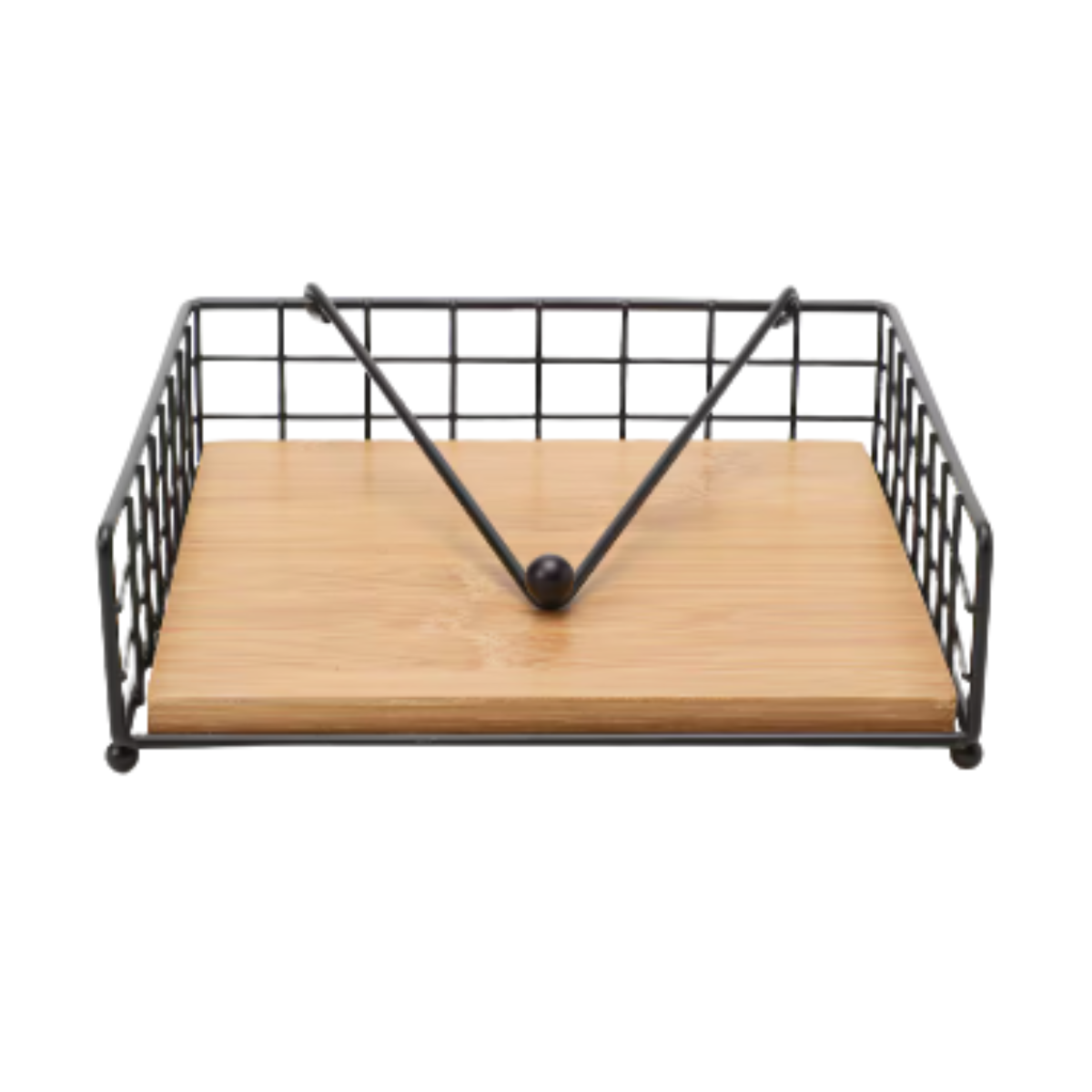 Porta guardanapo aramado com base em madeira, funcional e elegante para compor sua mesa.